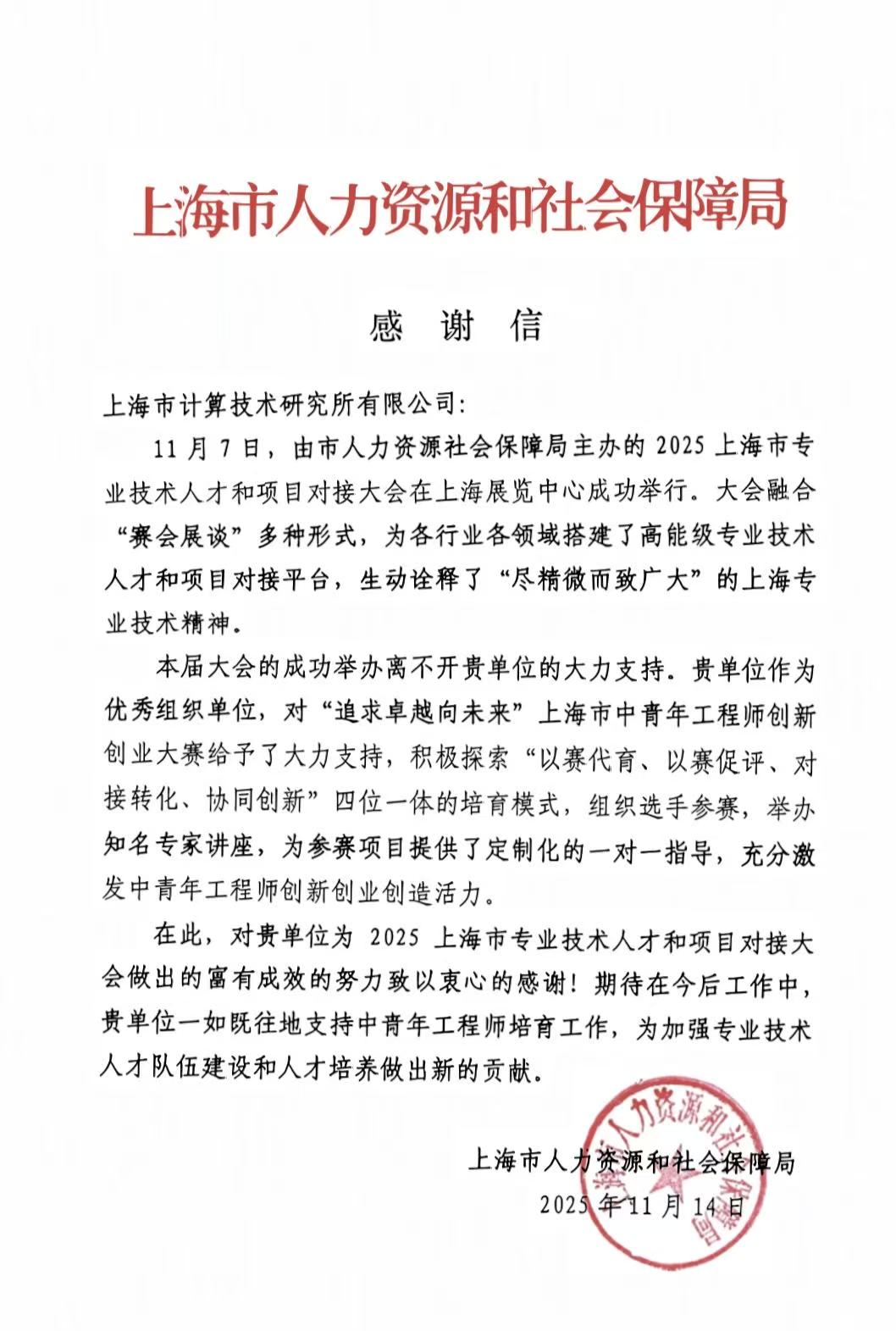近日,上海市人力資源社會(huì)保障局向上海市計(jì)算技術(shù)研究所有限公司發(fā)來感謝信。...
